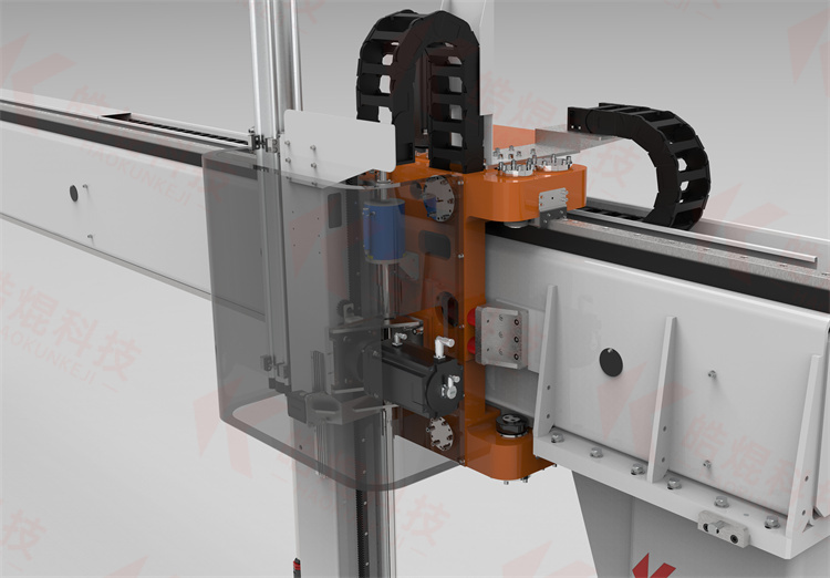 桁架機器人由多維機器人行走軸搭建而成。各機器人行走軸由型鋼焊接而成,滾輪直線導軌和齒輪齒條及伺服電機等組成。作為運動框架和載體的型鋼其截面形狀通過有限元分析法來優化設計,生產中的精益求精確保其強度和直線度,采用滾輪距型導軌作為運動導軌,運動傳動機構采用減速機和齒輪齒條或滾珠絲杠。